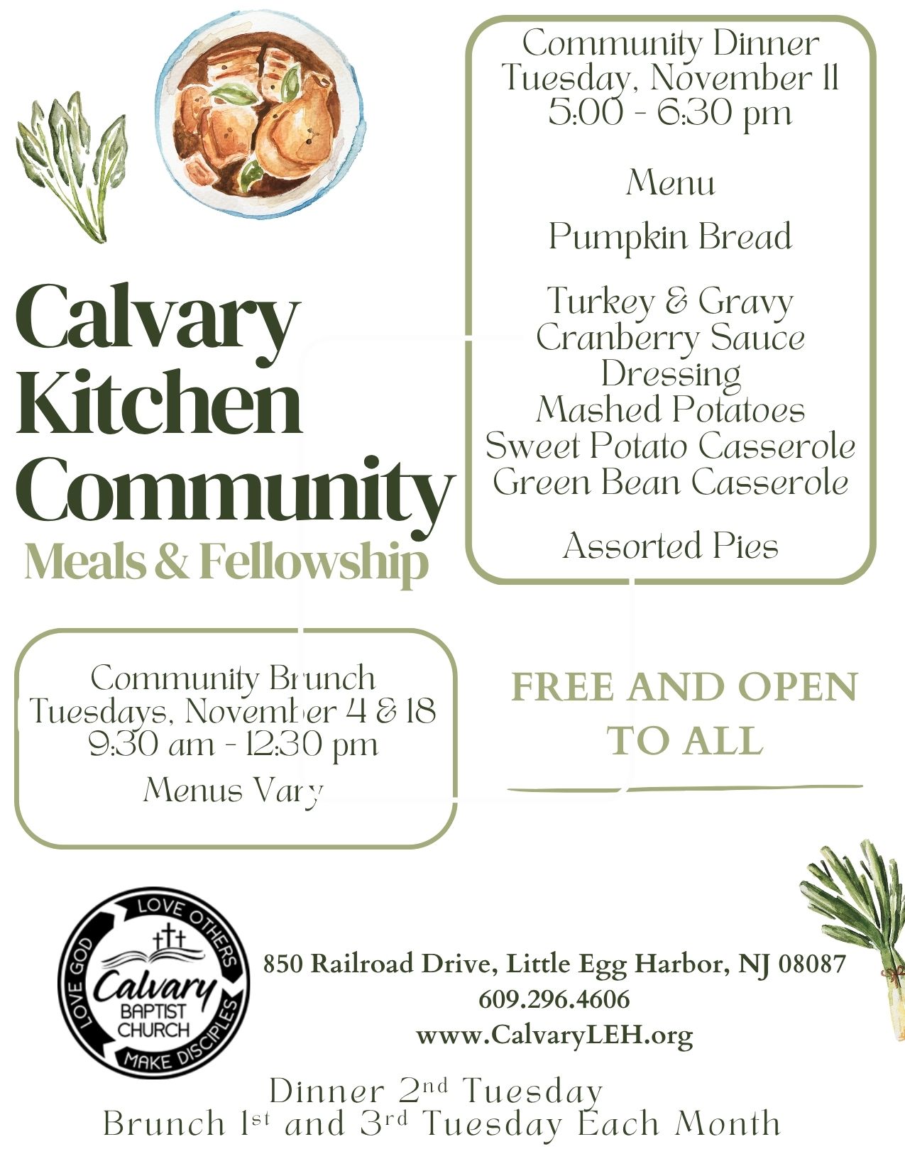 is open to anyone in our community, church family, and beyond. Come enjoy a delicious meal and fellowship with the Calvary Family! New menus each month.